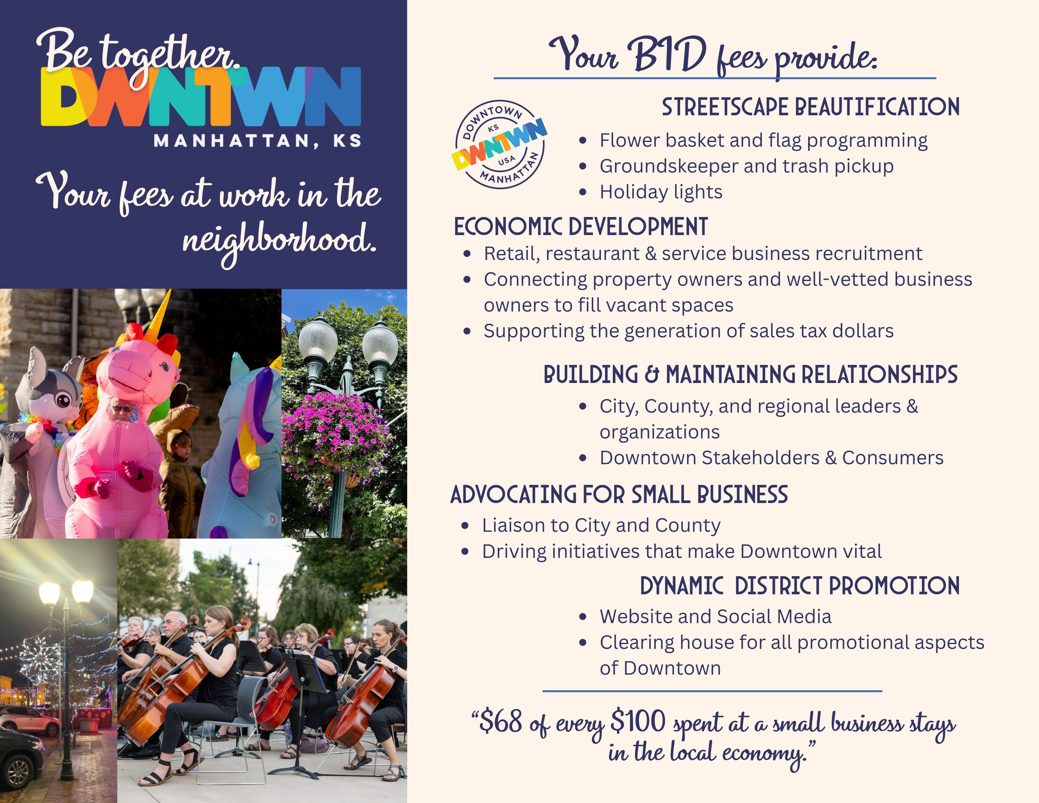 Each Downtown business or business space is billed annually for their DBID fee. Downtown businesses and property owners can expect to receive a bill in January from the City of Manhattan. Payments are due to the City of Manhattan by 5:00 PM, March 3rd. For information about your DBID bill, please contact Rina Neal.
