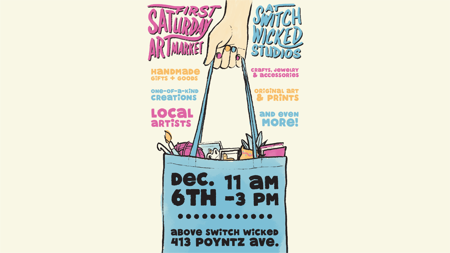 Join us on the first Saturday of every month for the First Saturday Art Market at Switch Wicked Studios! This indoor market showcases local artists working across a variety of styles and mediums—from prints and zines to paintings, handmade goods, and more. With space for up to 15 artists each month, it’s a perfect spot to discover new work, meet creatives, and support the local art scene.