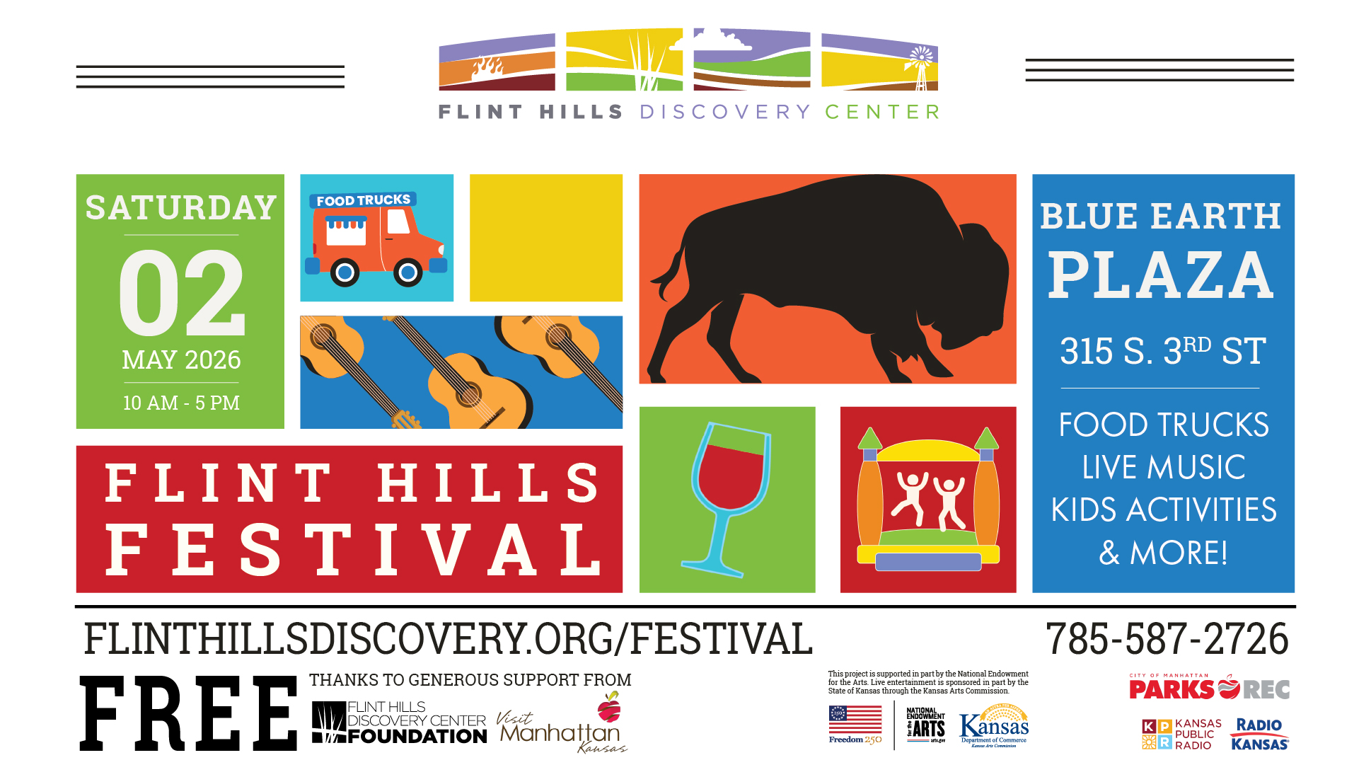 Experience the culture and beauty of the Flint Hills at our annual community festival. Admission to the Discovery Center and Festival are FREE this day thanks to Visit Manhattan and the Flint Hills Discovery Center Foundation.