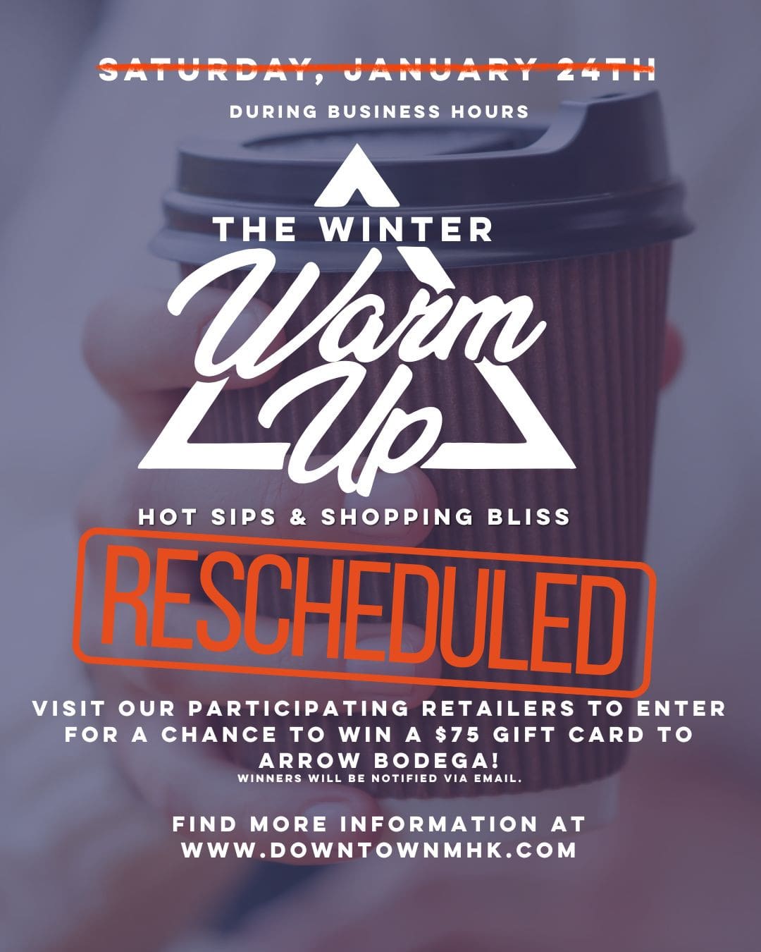 Due to the winter storm for Saturday, Jan 24th – we have rescheduled our Winter Warm up for