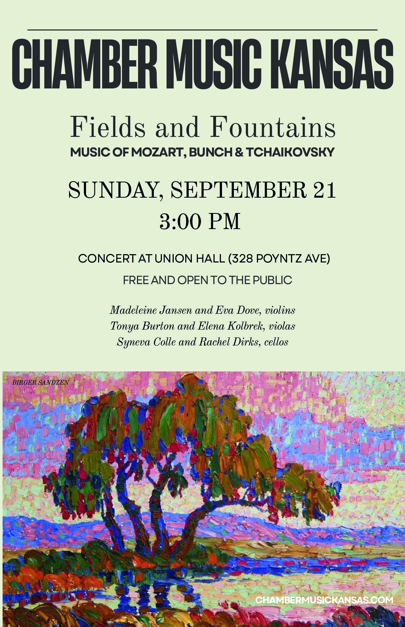 Union Hall 328 Poyntz Ave, ManhattanSunday, Sept. 21 @ 3:00pm Fields & Fountains: Music of Mozart, Bunch and Tchaikovsky (Free Concert at Union Hall) Catch the Season One kickoff concert of Chamber Music Kansas, a […]